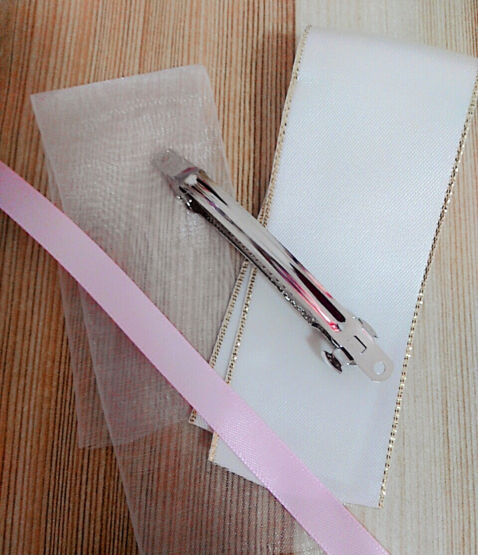 发饰diy|雪纱淑女款 阅读量 324 次 材料如图,雪纱和丝带长度一致,细丝带稍短至2cm将所有丝带用双面胶粘连起来将两条宽丝带一起折叠成蝴蝶结状,并用弹力棉线固定用胶枪粘合另取一条细丝带胶枪固定中间,并粘上夹子就完成了~( ̄▽ ̄~)~