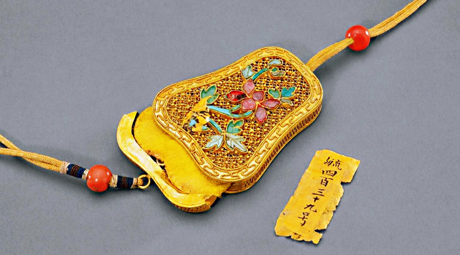 清,金镂花嵌松石翠片香囊,故宫博物院藏。