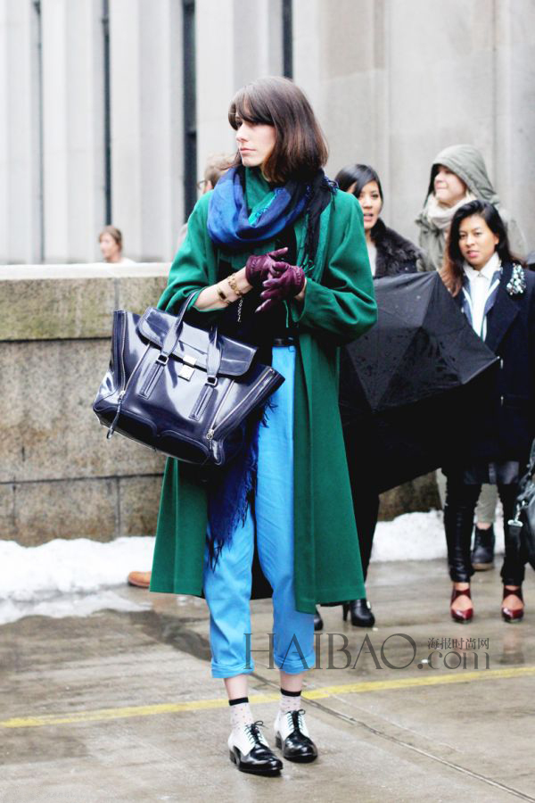 于蓝色与绿色之间的颜色,学名叫湖蓝,富有艺术感、相当迷人。蓝绿色长风衣搭配大号手提包,下半身是蓝色七分裤和黑白拼色布洛克鞋,非常有个人风格的一身一定能让人印象深刻。