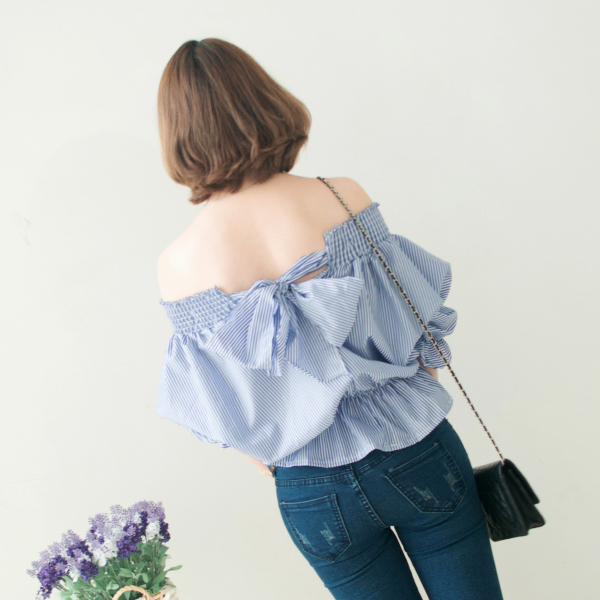LENA 韩国原单气质条纹一字领露肩蝴蝶结系带短款娃娃衫长袖上衣