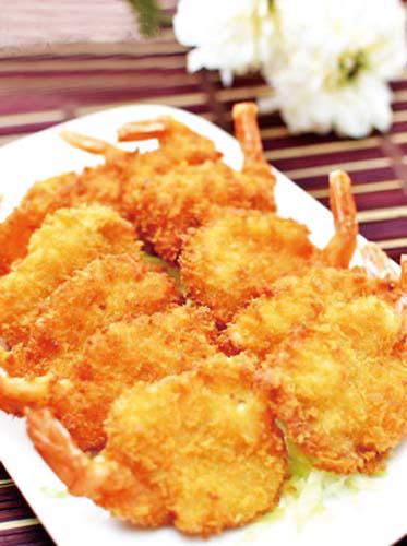 【黄金蝴蝶虾】1.鸡蛋打散,里面放点盐 鲜虾去头,去皮(留尾巴上的皮),去虾线,从虾背一端片开,平铺,不要切到底2.给虾上码点盐,提住虾尾巴,沾一层面粉,一层蛋液,再重复沾一层面粉,一层蛋液 3.把虾铺在面包屑里,铺满压实面包屑,然后抖掉碎屑 中等油温,炸到金黄。