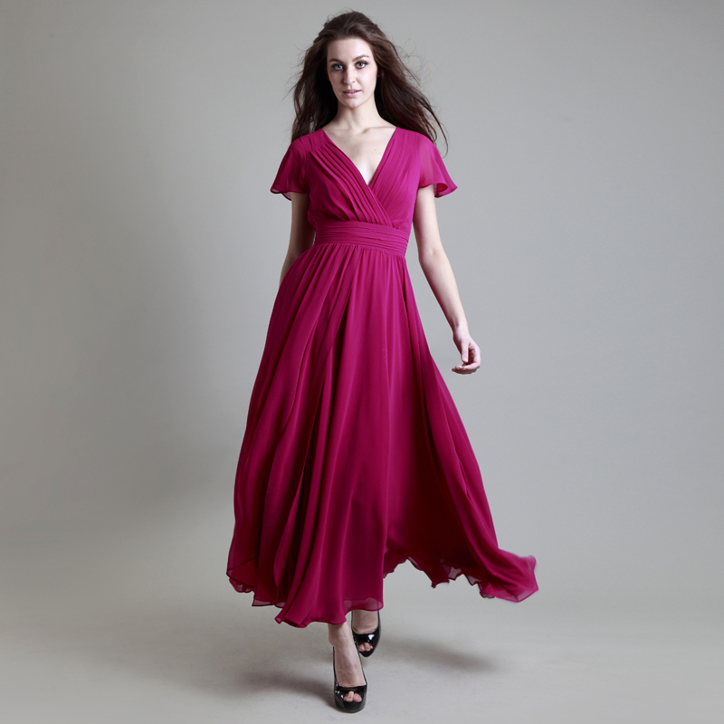 首尚格释2012原创新款时尚V领大摆玫红雪纺连衣裙晚礼长裙LYQ-080