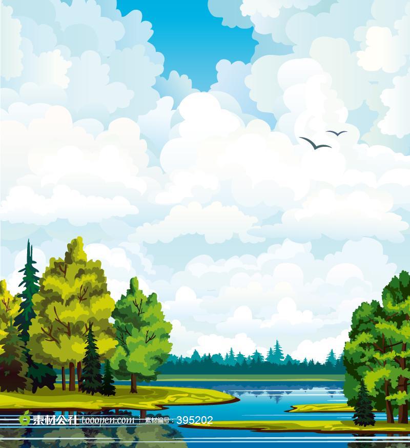 卡通森林湖泊风光背景矢量素材