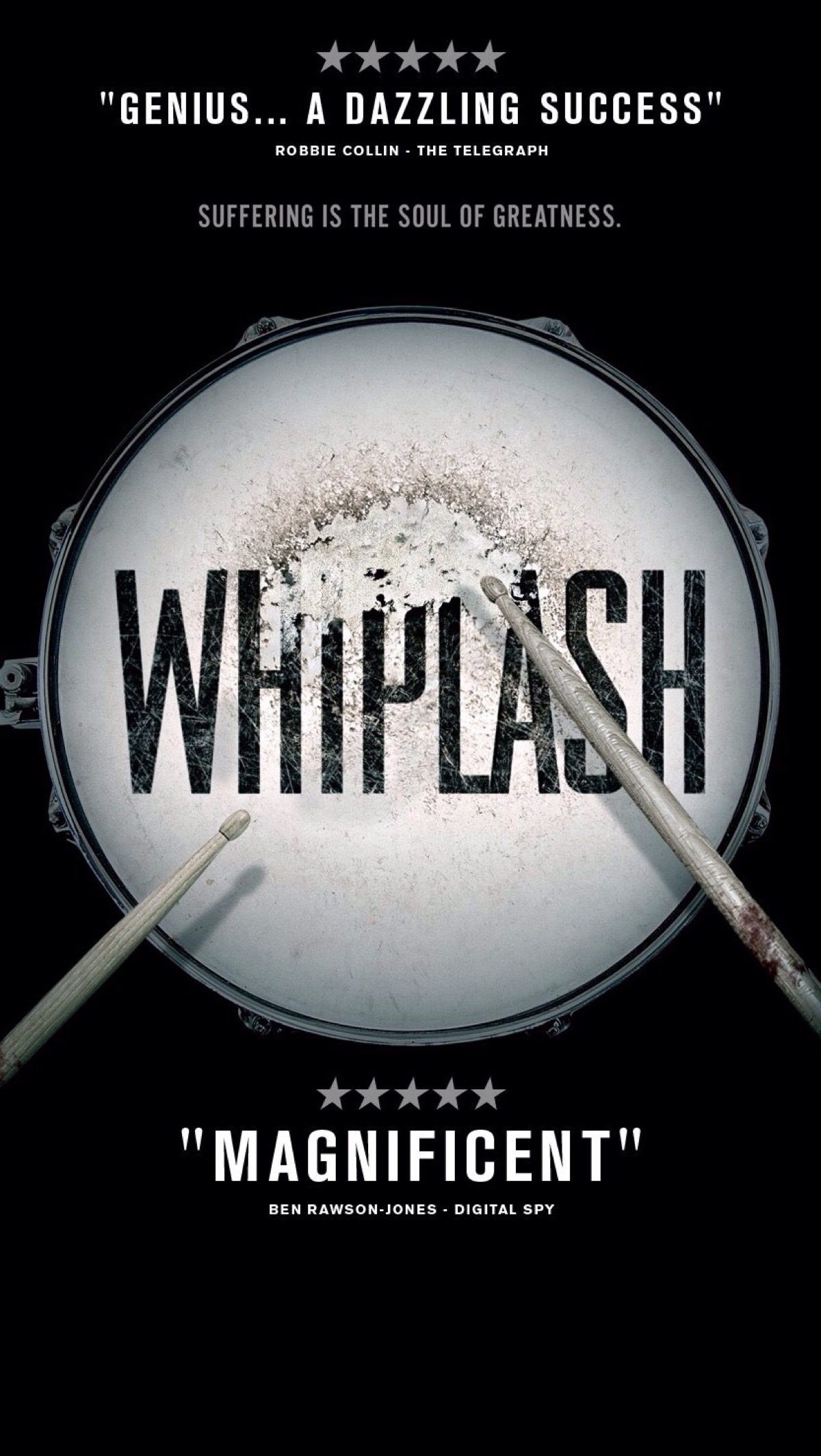 《爆裂鼓手》海报,以传奇乐手查理·帕克为目标的音乐学院新生安德烈,在加入竞争激烈的校爵士乐队之后,面对魔鬼导师弗莱彻近乎地狱般的训练,凭借对"伟大"的坚定追求和对音乐的无上热爱,刻苦坚持追求音乐乃至不疯魔不成活。