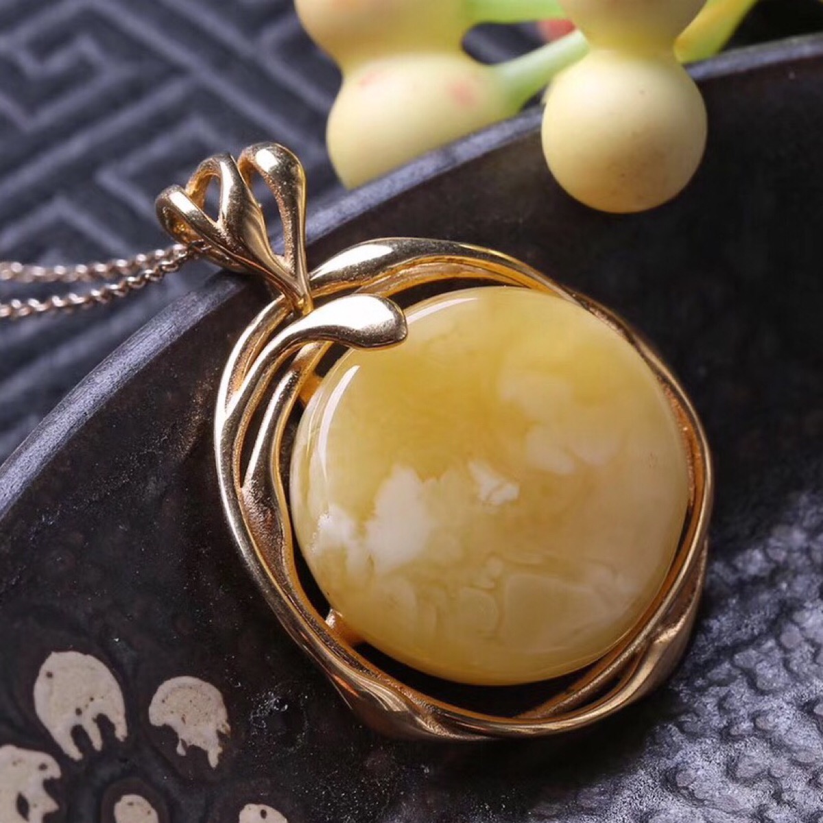 欧洲定制,925银镶嵌天然鸡油黄蜜蜡